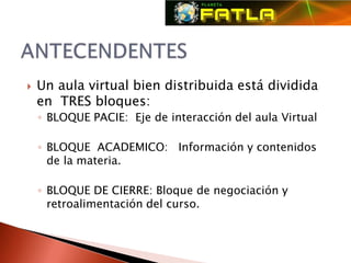 El documento describe la metodología PACIE para la distribución de un aula virtual. Un aula virtual bien distribuida contiene tres bloques principales: el bloque PACIE para la interacción, el bloque académico para los contenidos del curso, y el bloque de cierre para la negociación y retroalimentación al final del curso. El bloque de cierre permite terminar tareas pendientes, negociar calificaciones, y obtener opinión de los estudiantes para mejorar los cursos.