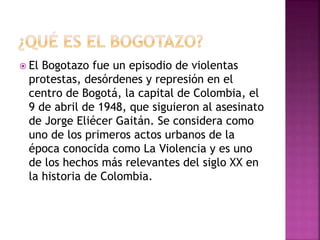 El asesinato del líder político y candidato presidencial colombiano Jorge Eliécer Gaitán el 9 de abril de 1948 en Bogotá provocó violentas protestas populares conocidas como El Bogotazo, durante las cuales se destruyeron 1425 edificaciones en el centro de la ciudad. Este evento marcó el inicio de una época de violencia política en Colombia conocida como La Violencia. La figura de Gaitán sigue siendo importante en la historia y cultura colombianas.