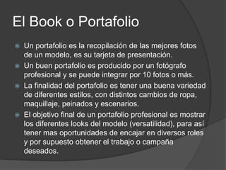 El documento describe los elementos clave de un portafolio de modelo y una sesión fotográfica. Explica que un portafolio contiene las mejores fotos de un modelo y muestra su versatilidad a través de diferentes estilos y escenarios. También detalla las tres etapas de una sesión - preproducción, producción y postproducción - y los factores importantes a considerar en cada una como la planificación, ubicación, casting y edición de imágenes. Además, enfatiza elementos como la composición, color, movimiento y amb