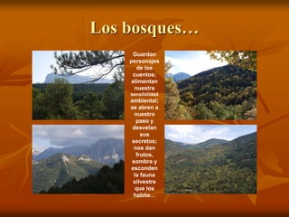 Este documento describe varios aspectos de los bosques, incluyendo que proveen refugio para la vida silvestre, alimentan nuestra conexión con la naturaleza, y sus árboles proveen frutos, sombra y recursos. También discute cómo los seres humanos han interactuado con los bosques a través de la historia para la tala, cultivo y pastoreo, y cómo la despoblación ha permitido un aumento en la masa forestal. Finalmente, destaca las bellezas de los bosques como los colores otoñales, musgos, lí