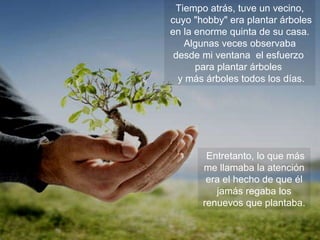 El documento relata la experiencia de un vecino que plantaba árboles sin regarlos, lo que transformó sus raíces en fuertes buscadoras de agua. El narrador reflexiona sobre la importancia de enfrentar adversidades para crecer y desarrollar fortaleza, en lugar de desear una vida sin dificultades. Finalmente, decide cambiar sus oraciones para que sus hijos tengan raíces profundas que les permitan resistir los desafíos de la vida.