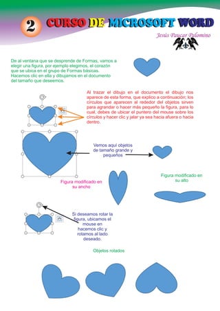 Este documento explica cómo utilizar las formas en Microsoft Word. Se puede acceder a las formas haciendo clic en la pestaña Insertar y luego en el botón Formas, el cual contiene varios dibujos preestablecidos. Una vez seleccionada una forma, se puede dibujar en el documento y modificar su tamaño, color de relleno y estilo de borde. El documento proporciona instrucciones detalladas sobre cómo realizar estas modificaciones a las formas.