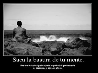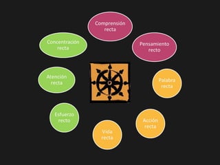 El documento resume la vida y enseñanzas de Buda. Explica que Buda, nacido príncipe Siddhartha Gautama, se percató del sufrimiento humano y buscó la iluminación a través de la meditación. Descubrió las Cuatro Nobles Verdades y el Óctuple Sendero para eliminar el sufrimiento siguiendo los principios de sabiduría, conducta ética y disciplina mental. Predicó su doctrina durante 45 años y fundó el Budismo, que se dividió luego en las ramas Theravada y Mah