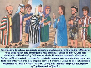 Jesús le cuenta al maestro de la Ley la parábola del Buen Samaritano para responder a su pregunta de quién es su prójimo. La parábola narra cómo un hombre fue asaltado en el camino de Jerusalén a Jericó y fue dejado medio muerto, mientras que un sacerdote y un levita lo ignoraron y pasaron de largo. Sin embargo, un samaritano se compadeció del hombre, lo curó, lo llevó a una posada y pagó por su cuidado, mostrándose como el verdadero prój