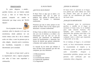 El documento habla sobre la importancia del buen trato en las relaciones humanas. Explica que el buen trato se manifiesta a través del contacto físico, las conversaciones, las miradas y los gestos. Además, señala que el buen trato se aprende principalmente en el hogar y que es necesario para tener éxito en el trabajo y en las interacciones sociales, ya que promueve la convivencia pacífica y el respeto entre las personas.
