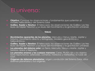 El documento analiza el modelo heliocéntrico del sistema solar basado en las observaciones de Galileo, Kepler y Newton, describiendo sus descubrimientos y leyes que explican los movimientos planetarios. Se aborda la evolución del pensamiento astronómico desde el geocentrismo hacia el heliocentrismo, y se explican conceptos fundamentales como la gravitación universal y las características del sistema solar. Además, se menciona la teoría del Big Bang y la ley de Hubble, que ofrecen una perspectiva sobre el origen y la expansión del universo.