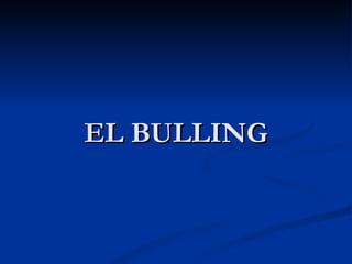 El bullying o acoso escolar se define como cualquier forma de maltrato psicológico, verbal o físico entre estudiantes de forma repetida que expone a la víctima física y emocionalmente y genera secuelas psicológicas. El acoso escolar intimida, reduce y somete emocional e intelectualmente a la víctima con el objetivo de obtener resultados favorables para los acosadores o satisfacer su necesidad de dominar a los demás. Los niños que acosan buscan la atención y reconocimiento que les falta y aprenden un modelo de