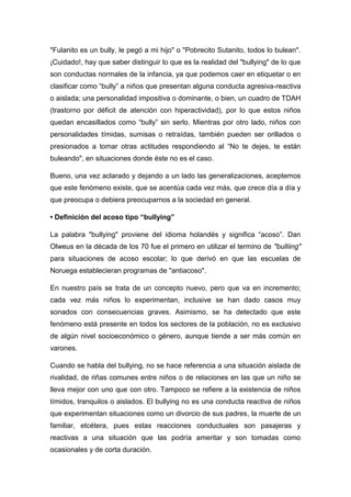 El documento define el bullying como agresiones físicas, verbales o emocionales sistemáticas que causan daño psicológico a la víctima. Estas agresiones se dan de manera repetida en contextos escolares u otros lugares fuera del hogar. Tanto el agresor como la víctima y los espectadores pueden sufrir consecuencias como baja autoestima, desinterés y desensibilización. Las causas del bullying incluyen ambientes familiares con agresiones constantes y falta de límites.