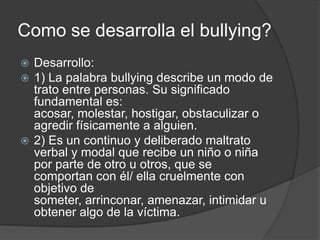 El bullying se caracteriza por el acoso continuo y deliberado de una persona por parte de otra u otras, ya sea de forma física, verbal, psicológica o social, con el objetivo de someter o intimidar a la víctima. Puede ocurrir tanto de forma directa como indirecta. Las víctimas suelen ser niños tímidos o inseguros, y como consecuencia del bullying pueden sufrir deterioro de la autoestima, ansiedad y depresión. El bullying causa repercusiones negativas en el desarrollo de la personalidad y la sal