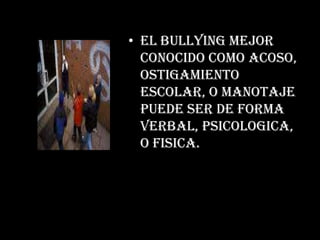 El bullying es un acoso verbal, psicológico o físico que afecta principalmente a jóvenes entre 12 y 13 años, aunque las mujeres son más propensas a ser víctimas.