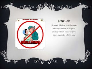Este documento describe diferentes tipos de acoso escolar y cómo prevenirlos. Explica que el acoso incluye bloqueo social, manipulación social, hostigamiento, coacción y describe las características psicológicas comunes de los agresores. Recomienda denunciar el acoso a los directivos de la escuela, a los padres y realizar una prevención primaria a través de la educación y los medios de comunicación.