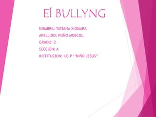 El documento describe el bullying, incluyendo sus tipos (físico, verbal y psicológico), características, participantes (agresor, víctima y observadores) y consecuencias. Explica que el bullying implica un maltrato sistemático y estratégico de una víctima por parte de un agresor, con el objetivo de someter y asustar a la víctima a través de burlas y agresiones repetidas.