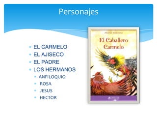 El documento presenta una lista de personajes que aparecerán en la historia del caballero carmelo. Entre los personajes se encuentran El Carmelo, El Ajiseco, El Padre, Los Hermanos, Anfiloquio, Rosa, Jesús y Héctor.