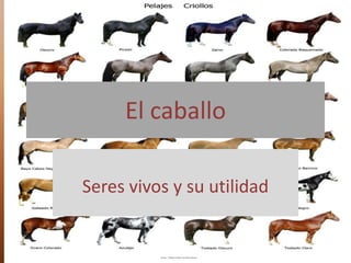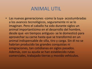 El documento describe la evolución del caballo desde su antepasado más temprano, el Eohippus, hasta el caballo moderno. Explica que el Eohippus era un animal pequeño que vivió hace aproximadamente 60 millones de años. A lo largo del tiempo, el caballo evolucionó para desarrollar un único dedo con pezuña para correr más rápido y tener una visión lateral mejor para defenderse. El documento también señala que el caballo ha sido un animal importante para el desarrollo humano al utilizarse durante siglos para el transporte y el trabajo ag