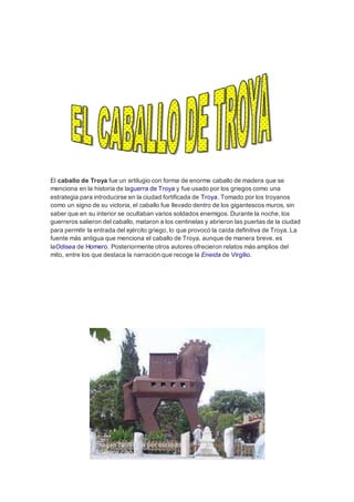 El documento describe el caballo de Troya, una estratagema usada por los griegos para introducirse en la ciudad fortificada de Troya durante la guerra de Troya. Los griegos construyeron un enorme caballo de madera y ocultaron soldados en su interior. Los troyanos llevaron el caballo dentro de sus muros como un trofeo, sin saber que por la noche los soldados griegos saldrían y abrirían las puertas para permitir la entrada del ejército enemigo, lo que condujo a la caída de Troya.