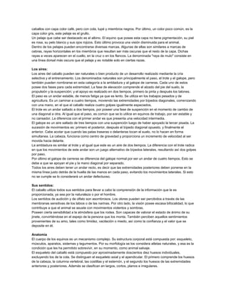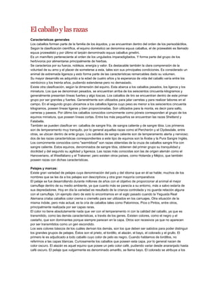 El documento describe las características generales del caballo, incluyendo su clasificación científica, rasgos físicos y longevidad. También cubre las diferentes razas de caballos según su tamaño, temperamento y orígenes, así como los pelajes, marcas y aires naturales del caballo. Por último, resume los sentidos y anatomía del caballo, destacando su esqueleto, músculos y casco.