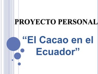 El proyecto personal 'El cacao en el Ecuador' tiene como objetivo demostrar la calidad del chocolate producido a partir de diferentes tipos de cacao y la importancia de la exportación cacaotera. Se incluyen encuestas y un análisis sobre la preferencia del público hacia el chocolate de aroma, que es considerado superior en sabor. El proyecto concluye que la información presentada es clara y logra captar el interés del público sobre la producción de chocolate en Ecuador.
