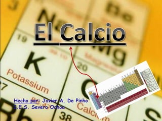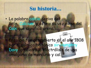 El calcio fue descubierto en 1808 por Humphry Davy mediante la electrólisis de una amalgama de mercurio y cal. Es un elemento importante que forma parte de los huesos y dientes y ayuda a controlar la composición de los fluidos corporales. Se encuentra de forma natural en la corteza terrestre y se ingiere principalmente a través de los lácteos.