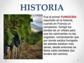 El caldo bórdeles, un fungicida histórico, se utiliza para prevenir y controlar enfermedades fúngicas en cultivos al evitar el desarrollo de hongos. Se prepara mezclando sulfato de cobre, hidróxido de calcio y agua, y debe aplicarse inmediatamente tras su preparación, evitando mezclas con otros productos. Es económico, fácil de aplicar y eficaz, aunque no tiene acción curativa y requiere de cuidado al momento de la aplicación.