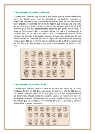 Los mayas desarrollaron calendarios precisos, siendo el más sofisticado el calendario de 260 días llamado Tzolkin que guiaba su vida. Combinando Tzolkin con un calendario de 365 días llamado Haab, crearon un ciclo mayor de 18,980 días. Los mayas también llevaban una cuenta continua de días desde el 13 de agosto de 3114 a.C., llamada la Cuenta Larga o Serie Inicial.