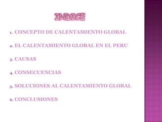 El documento trata sobre el calentamiento global. Explica que el calentamiento global está afectando al Perú y al mundo debido a causas naturales y humanas como los gases de efecto invernadero. Sus consecuencias incluyen el deshielo de los polos y el aumento de las temperaturas. Para combatirlo se deben reducir las emisiones de carbono, aunque eventualmente la humanidad tendrá que emigrar a otros planetas.