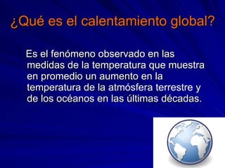 El calentamiento global es el aumento observado de la temperatura promedio de la atmósfera y los océanos en las últimas décadas. El efecto invernadero mantiene una temperatura estable en la Tierra a través de los gases de invernadero, pero la quema de combustibles, deforestación y ganadería han incrementado su emisión, lo que puede traer malnutrición, enfermedades diarreicas, malaria y problemas cardiorrespiratorios a los seres humanos.