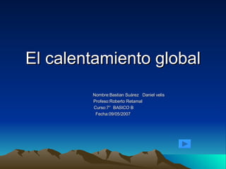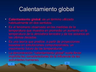 El documento describe el calentamiento global como un aumento observado en las temperaturas de la atmósfera y los océanos en las últimas décadas, así como una teoría que predice mayores temperaturas futuros si continúan las emisiones de gases de efecto invernadero. La opinión científica mayoritaria es que la mayor parte del calentamiento de los últimos 50 años se debe a la actividad humana, principalmente debido al aumento de dióxido de carbono según simulaciones.