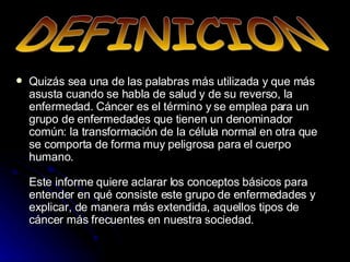 Este documento proporciona información sobre diferentes tipos de cáncer, incluyendo definiciones, causas y tratamientos. Describe los cánceres más comunes como el de mama, pulmón, vejiga, piel, próstata, colon, boca y esófago, hígado, estómago y páncreas. Explica que el cáncer se produce por el crecimiento anormal de células y puede ser benigno o maligno. También cubre factores de riesgo, síntomas e implicaciones del diagnóstico y tratamiento