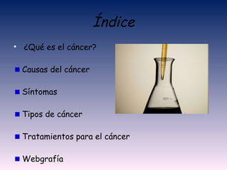 El cáncer no es una enfermedad única sino muchas enfermedades causadas por el crecimiento anormal de células. Los tumores pueden ser benignos o malignos. Los factores de riesgo incluyen el tabaco, la dieta, el alcohol y la genética. Los síntomas dependen de la ubicación y tamaño del tumor. Los principales tratamientos son la cirugía, radioterapia y quimioterapia, cada uno con sus propios efectos secundarios.
