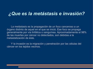 El cáncer se define como un conjunto de enfermedades en las que las células crecen de forma anormal y pueden invadir otros tejidos. Los tumores pueden ser benignos o malignos, siendo estos últimos los que pueden propagarse a otros órganos a través de la metástasis. El cáncer se diagnostica mediante biopsia y su tratamiento incluye cirugía, quimioterapia y radioterapia. Factores como dejar de fumar, mantener una dieta saludable y evitar la exposición excesiva al sol pueden ay