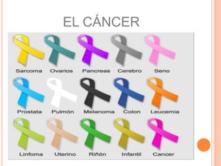 Este documento proporciona información sobre varios tipos de cáncer, incluidos el cáncer de mama, próstata, cuello uterino, colorrectal, pulmón, estómago y sus síntomas, factores de riesgo, tipos, prevención, diagnóstico y tratamiento. Explica que el cáncer se produce por el crecimiento anormal de células y que puede afectar diferentes partes del cuerpo si no se trata a tiempo.