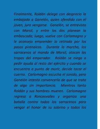 El documento narra la batalla de Roncesvalles, donde el conde Roldán, sobrino de Carlomagno, se enfrenta a las tropas sarracenas en una contienda desigual tras la traición de Ganelón. Roldán y sus hombres luchan valientemente y, a pesar de su valentía, mueren en la batalla, causando la ira de Carlomagno, quien busca venganza. Al final, se condena a Ganelón por su traición, mientras se lamenta la pérdida del noble Roldán.