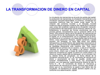 El documento resume los conceptos clave del libro "El Capital" de Carlos Marx sobre la mercancía, el dinero y el capital. En 3 oraciones: