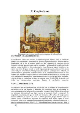 El capitalismo se define como un sistema económico basado en la propiedad privada de los medios de producción y la búsqueda de beneficios. Sus características incluyen la iniciativa privada y la competencia en el mercado. El capitalismo pasó por tres etapas: el mercantilismo desde los siglos XIV-XVIII, el industrialismo desde los siglos XVIII-XIX impulsado por la revolución industrial, y el imperialismo o capitalismo monopolio desde los siglos XIX-XXI dominado por oligarquías financieras en países desarrollados.