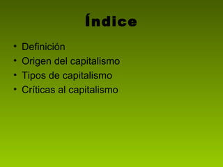 El documento define el capitalismo como un sistema económico donde las personas e intercambian bienes y servicios a través de transacciones de precios. Explica que el capitalismo surgió en el siglo XVII en Inglaterra cuando reemplazó al feudalismo. Además, describe tres tipos de capitalismo: mercantil, industrial y financiero. Finalmente, señala que una de las críticas al capitalismo es que explota la fuerza de trabajo humana al tratar el trabajo como una mercancía más.