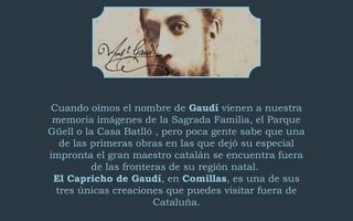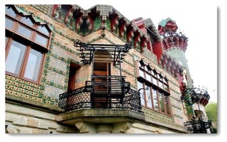 El Capricho de Gaudí en Comillas fue uno de los primeros proyectos de Gaudí fuera de Cataluña. Fue construido como casa de verano para un hombre adinerado y muestra el estilo árabe e influencia de la naturaleza típicos de Gaudí, con azulejos decorativos y la flor de girasol como tema central. Actualmente el Capricho funciona como museo-restaurante.