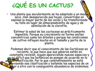 Este documento describe las características de los cactus. Explica que los cactus se han adaptado a climas secos, carecen de hojas y almacenan agua en sus tallos. También describe las diferentes formas que pueden tener los cactus (redondos, cilíndricos o aplanados), sus espinas, raíces y necesidades de cuidado como riego y exposición a la luz. El documento provee una introducción general sobre la morfología y necesidades básicas de los cactus.