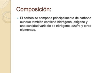 El carbón se forma a partir de la descomposición de restos vegetales enterrados hace millones de años. Contiene principalmente carbono e incluye diferentes tipos como la turba, el lignito, la hulla y la antracita. Se extrae mediante minería subterránea o a cielo abierto y se usa principalmente para generar electricidad, aunque también tiene usos en la siderurgia y otros procesos industriales. Tiene la ventaja de ser abundante y producir energía de forma económica y estable, pero genera contaminación y es un recurso no