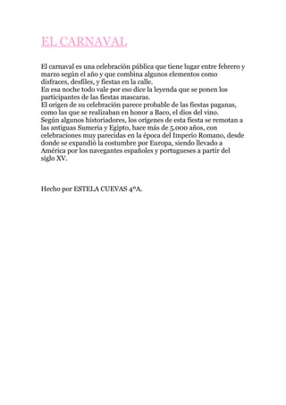El carnaval es una celebración pública que tiene lugar entre febrero y marzo y combina disfraces, desfiles y fiestas en la calle, originada probablemente de fiestas paganas en honor a Baco, aunque sus orígenes se remontan a celebraciones similares hace más de 5,000 años en Sumeria y Egipto que se expandieron durante el Imperio Romano y luego a América por los españoles y portugueses a partir del siglo XV.