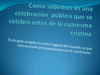 El documento describe cómo se celebra el Carnaval en diferentes partes del mundo, incluyendo Ecuador, Brasil, España y México, señalando que es una celebración pública antes de la Cuaresma asociada principalmente con el catolicismo y que se celebra cada año de diferentes maneras en varios lugares.