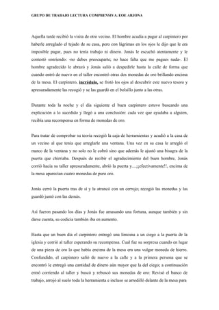Este cuento cuenta la historia de Jonás, un carpintero con un corazón de oro que ayuda a los demás sin esperar nada a cambio. Después de cada buena acción, encuentra monedas de oro en su taller, lo que aumenta su codicia. Eventualmente, las monedas se convierten en hierro cuando deja de ayudar a los demás. Al final, aprende que la verdadera recompensa es ayudar a los demás sin esperar nada a cambio.