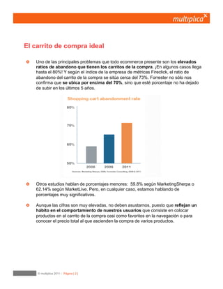 Este documento ofrece 75 ideas para mejorar el proceso de checkout y reducir el abandono de carritos de compra en ecommerce. Algunas de las sugerencias clave incluyen simplificar el proceso a solo 3 pasos (envío, pago y confirmación), ofrecer envío gratuito cuando sea posible, y asegurar que el proceso sea rápido y fluido para mejorar la experiencia del usuario.