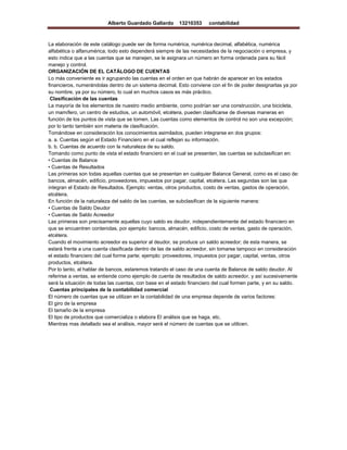 El documento habla sobre el catálogo de cuentas que una empresa debe establecer para organizar y clasificar sistemáticamente todas las cuentas utilizadas en su contabilidad. Explica que el catálogo debe asignar números a cada cuenta de forma ordenada y puede tener una clasificación decimal. También menciona que las cuentas se clasifican principalmente en cuentas de balance y de resultados, y por la naturaleza de su saldo entre deudor y acreedor.