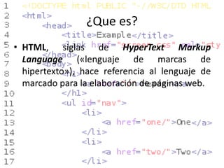 HTML es el lenguaje de marcado usado para crear páginas web. Consiste en elementos como etiquetas que definen la estructura del contenido como texto, imágenes y otros elementos. Algunos elementos básicos incluyen <html> para definir el documento, <head> para metadatos, y <body> para el contenido principal. Etiquetas comunes en el cuerpo son <h1-h6> para encabezados, <img> para imágenes, y etiquetas para estilos de texto como negrita y cursiva.