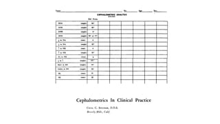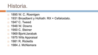 Este documento describe el cefalograma y su historia, definiciones, técnica y puntos de referencia. Explica los análisis cefalométricos de Steiner y Tweed, incluyendo sus valores angulares y métricos clave. Finaliza con referencias bibliográficas sobre los métodos de Steiner y Tweed.