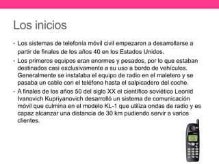 El documento describe la historia y evolución de los teléfonos celulares desde sus inicios en la década de 1940 hasta la actualidad. Explica las cinco generaciones de telefonía móvil (1G a 4G) y los avances tecnológicos clave de cada una, como la digitalización, el aumento de la capacidad de datos y la popularización del GSM. También resalta algunas ventajas como la conectividad constante y desventajas como la adicción y dependencia a estos dispositivos.