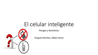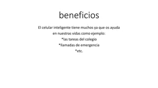 El documento describe los principales beneficios y riesgos del uso de teléfonos inteligentes. Entre los beneficios se encuentran que ayudan con las tareas escolares y del trabajo, proveen acceso a información en Internet, y permiten llamadas rápidas en emergencias. Algunos riesgos son la adicción a los dispositivos, el rastreo de ubicación, dar información personal a desconocidos, y distracción al conducir que puede causar accidentes.