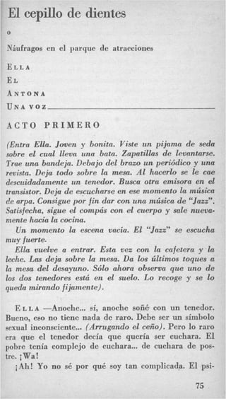 Este documento presenta un diálogo entre Ella y El durante el desayuno. Ella escucha el pronóstico del tiempo en un audífono y realiza ejercicios de relajación extraños, mientras evita servirle el café a El. El se muestra irritado por la falta de café y los comportamientos de Ella. El diálogo expone las tensiones en su matrimonio a través de sus interacciones durante el desayuno.