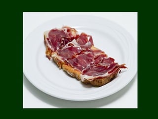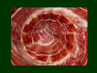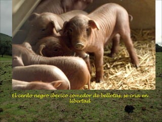 El documento describe la tradicional cría del cerdo ibérico en la Sierra de Aracena y Jabugo en España. Durante los meses de noviembre a marzo, los cerdos ibéricos se alimentan de bellotas en las dehesas, engordando de 90 kg a 160 kg e incrementando su grasa y sabor característicos. La carne resultante del cerdo ibérico criado de esta manera tradicional tiene propiedades saludables y un sabor único debido a su dieta de bellotas. El documento también describe pueblos como Aracena y Jab