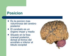 El cerebelo es la porción más voluminosa del cerebro posterior. Se encuentra detrás del tronco encefálico e inferior al lóbulo occipital. Tiene forma de ovoide aplanado y está compuesto por dos hemisferios cerebelosos unidos por una estructura mediana llamada vermis. Internamente, está compuesta de sustancia gris en la superficie y sustancia blanca en el interior. Se conecta con otras partes del sistema nervioso central a través de tres pedúnculos cerebelosos.